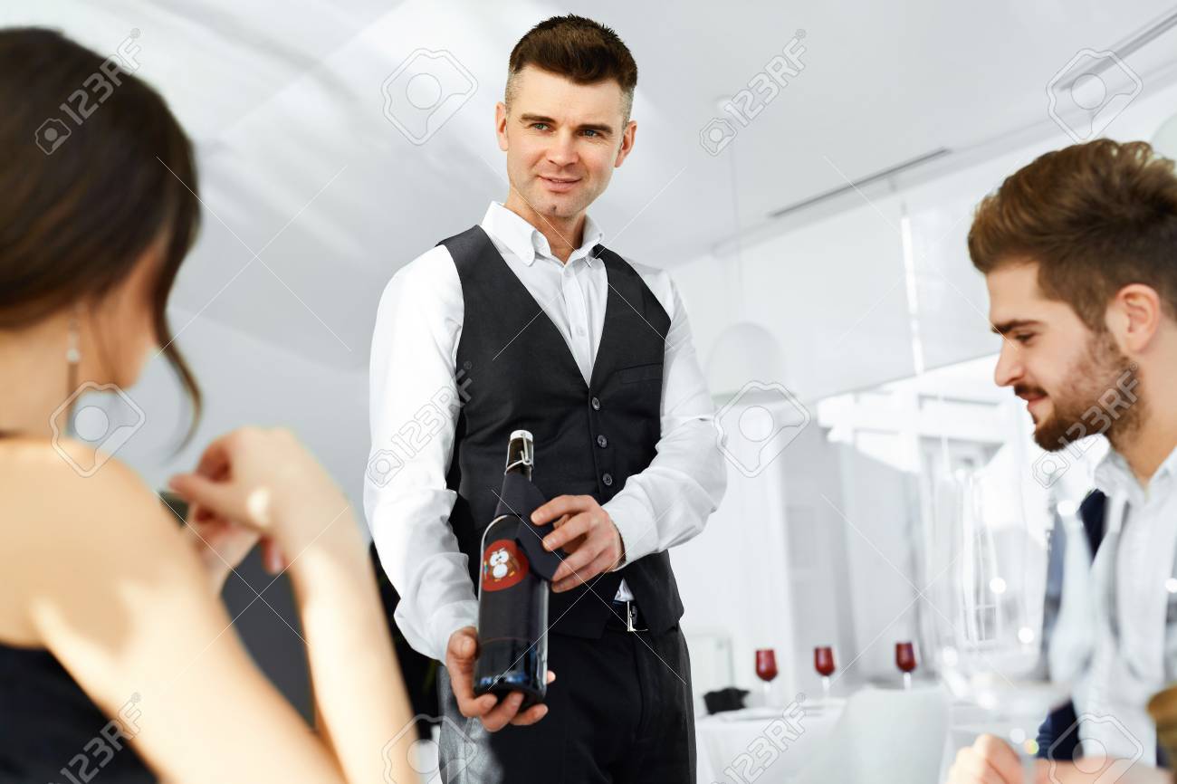 Cena Romantica La Presentacion De Sumiller Mejor Vino A Pareja Feliz En El Amor Las Personas Que Tienen Fecha En El Restaurante Gourmet La Celebracion De Aniversario O El Dia De San