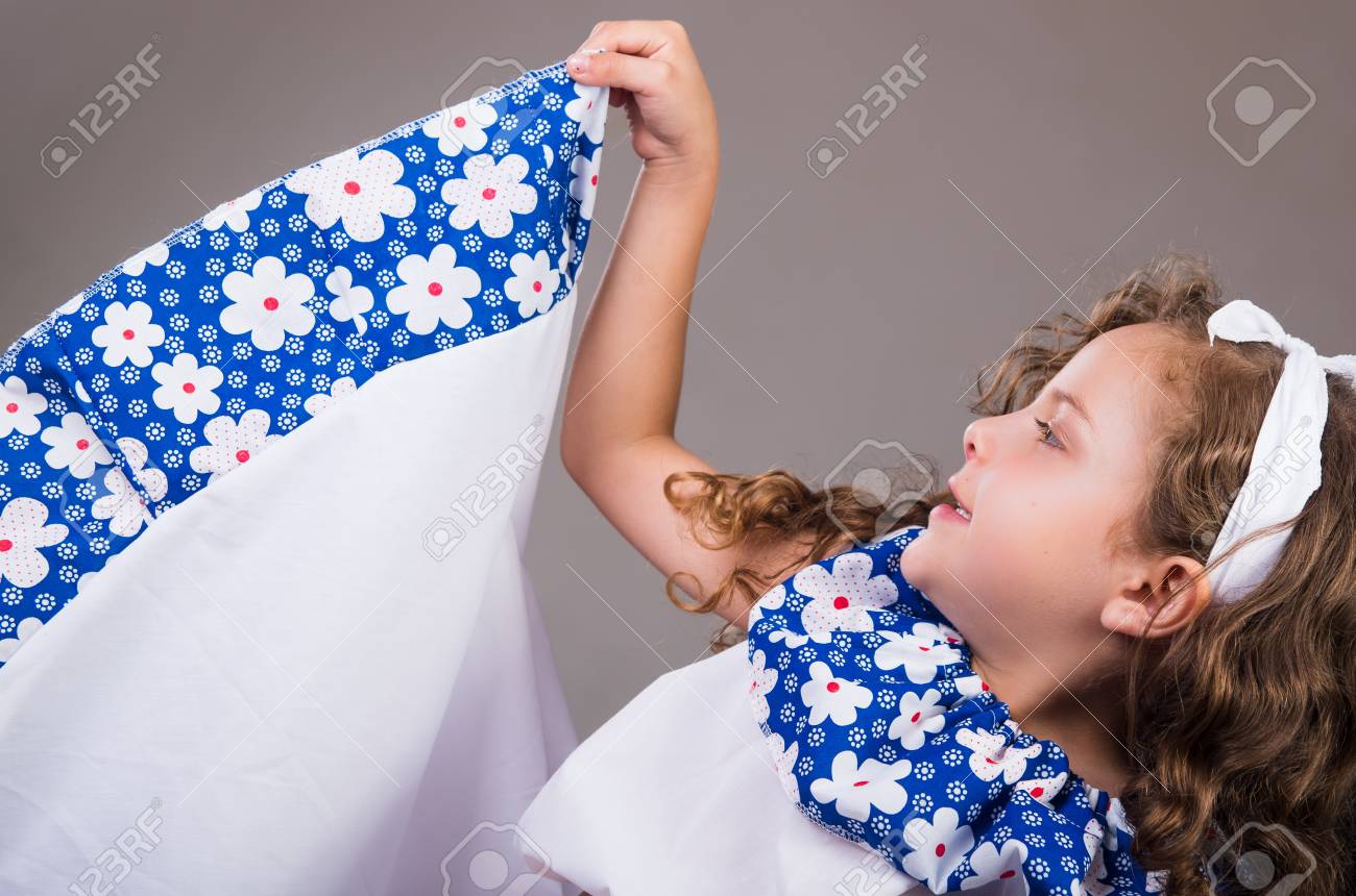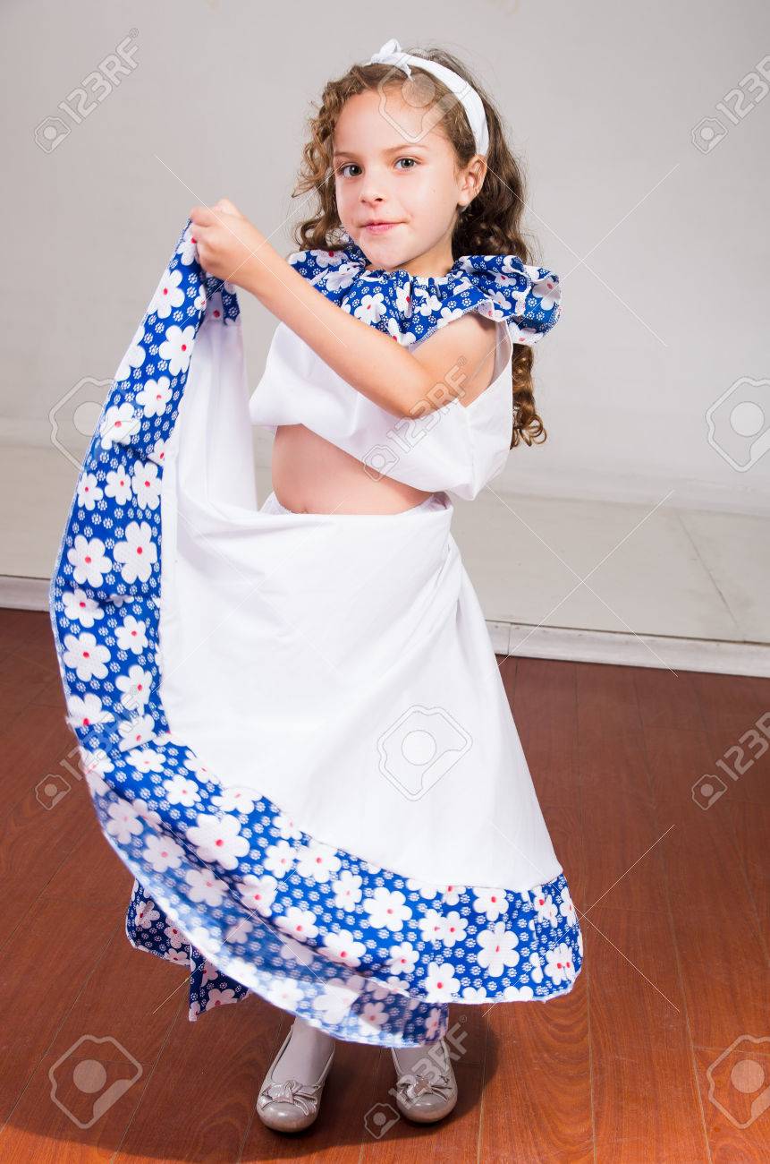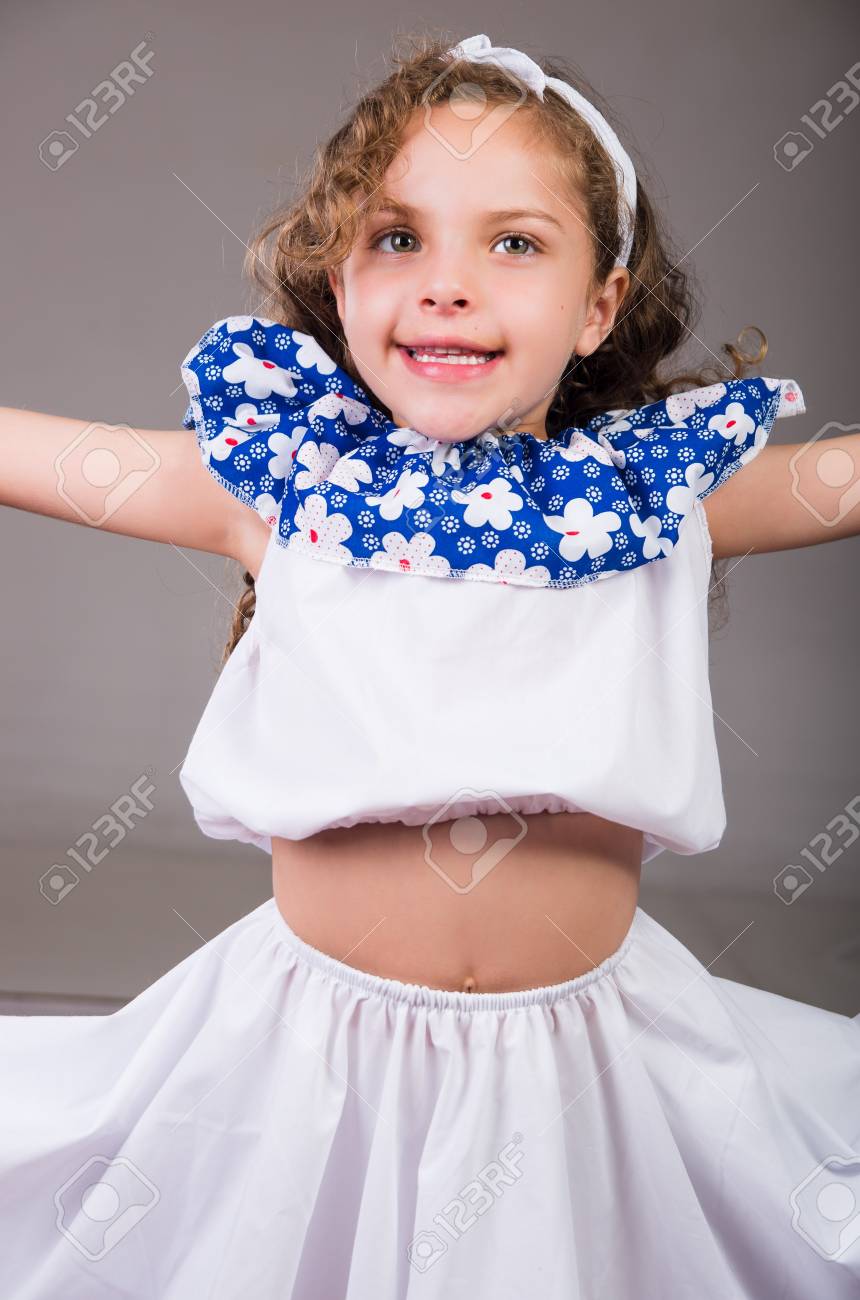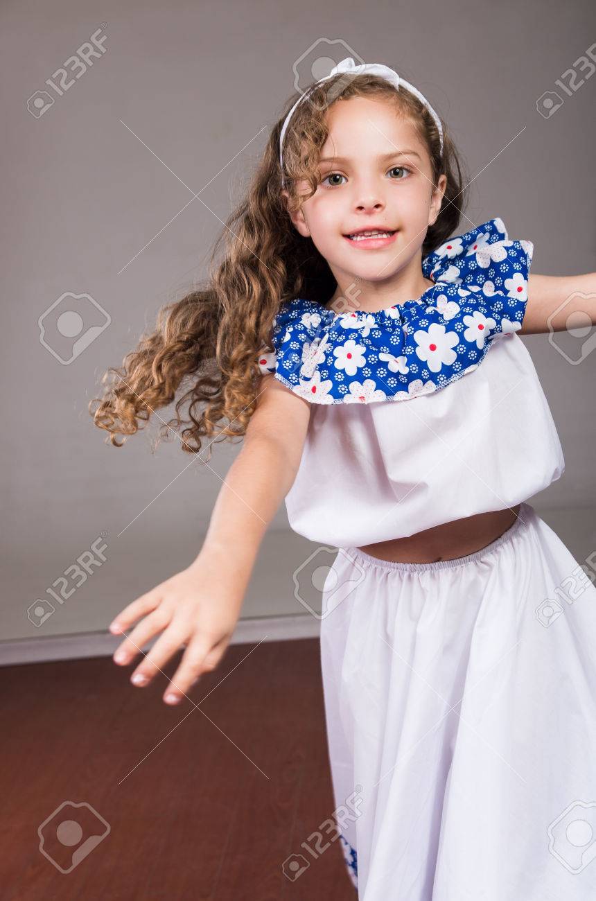 Nina Linda Que Llevaba Un Hermoso Vestido Blanco Y Azul Con Cinta Para La Cabeza A Juego Que Presenta De Forma Activa Para La Camara El Fondo Del Estudio Fotos Retratos Imagenes