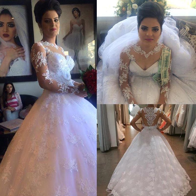 Compre Sexy Una Linea De Vestidos De Novia Cuello En Forma De Corazon Transparente De Manga Larga De Encaje Apliques Volver Cremallera Cola Vestido De Boda Paquete Personalizado A 104 27 Del