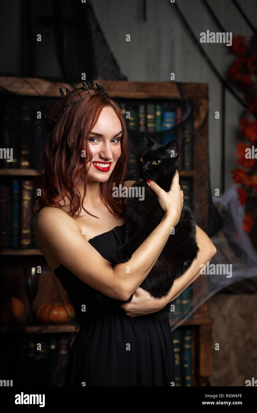 Hermosa Joven En Vestido Negro Con Gato Negro Interior Fotografia De Stock Alamy