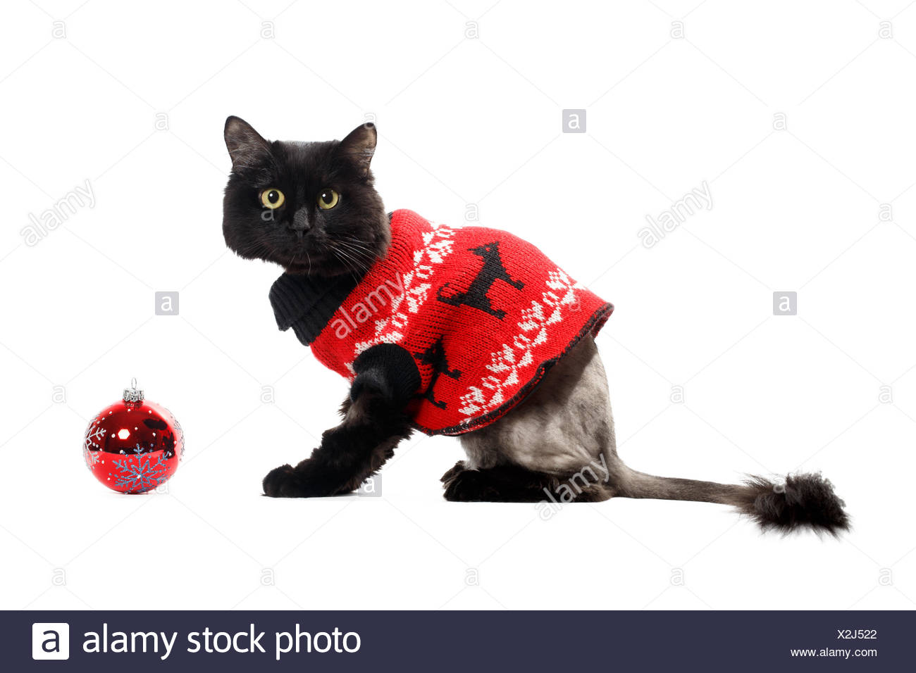 Gato Negro Vestidos De Rojo En Una Chaqueta Con Bolas De Navidad Fotografia De Stock Alamy