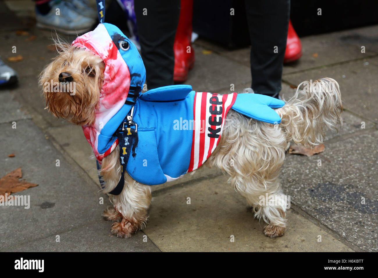 Londres Reino Unido El 30 De Octubre De 2016 Billy The Yorksire Terrier Vestido Como Un Tiburon Para Su Traje De Disfraces De Halloween Para Todos Los Perros Importa Halloween Perro A