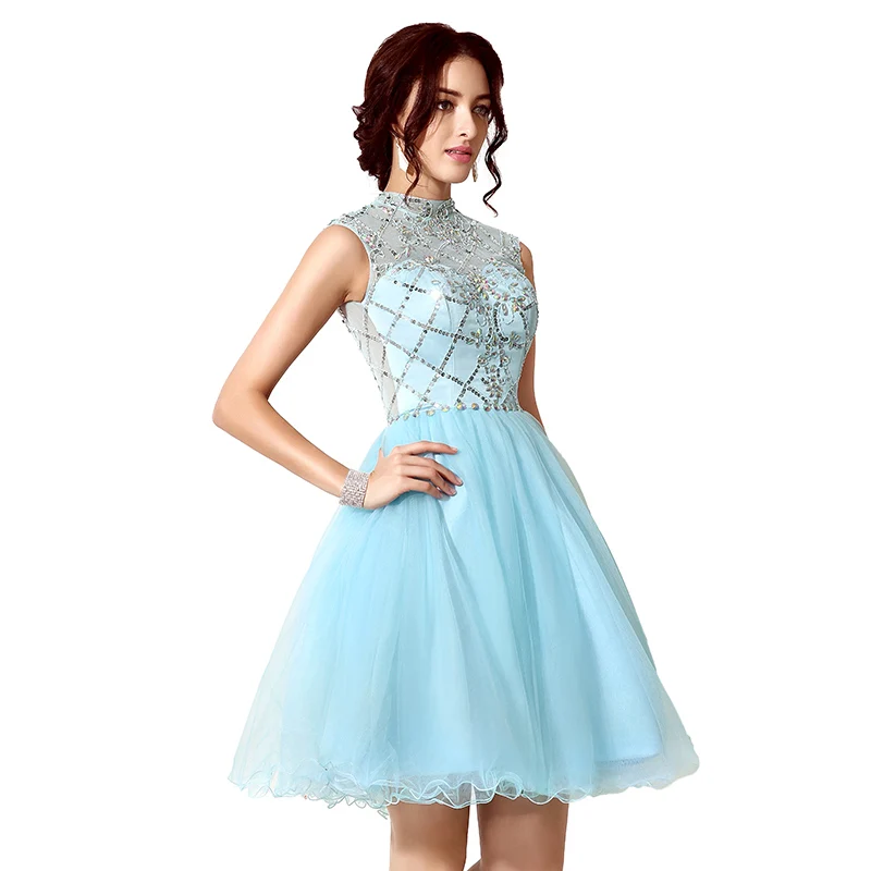 Vestidos De Coctel Con Cuentas De Cristal Para Mujer Y Nina Vestido Corto De Tul Azul Cielo Con Cuello Alto Para Baile De Graduacion Vestido De Fiesta De Regreso A La Graduacion