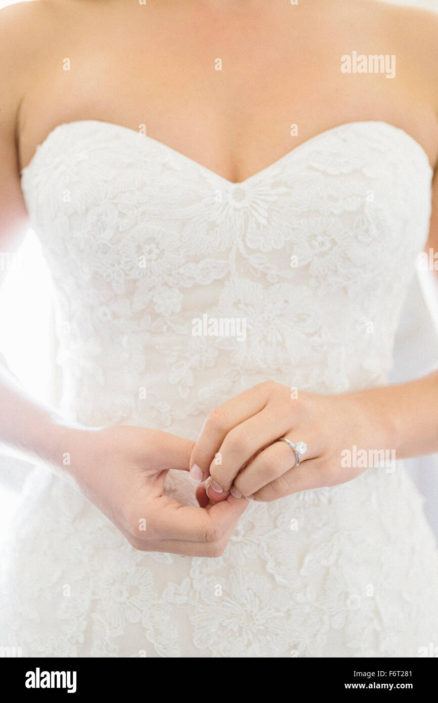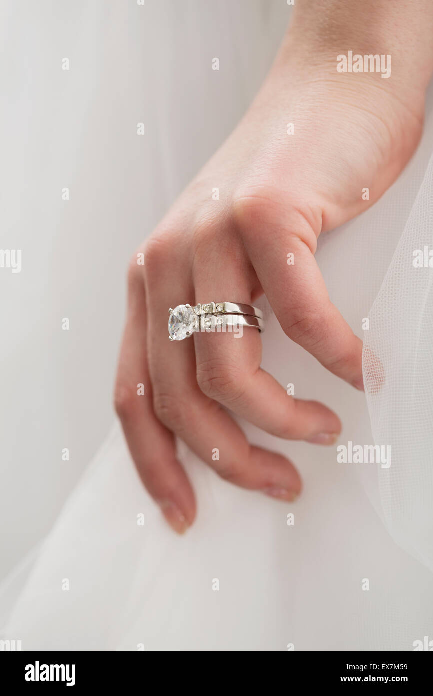 Detalle De La Mano De Una Novia Con Un Anillo De Compromiso Que Toca El Vestido Imagen De Archivo Imagen De Toca Mano 134456079