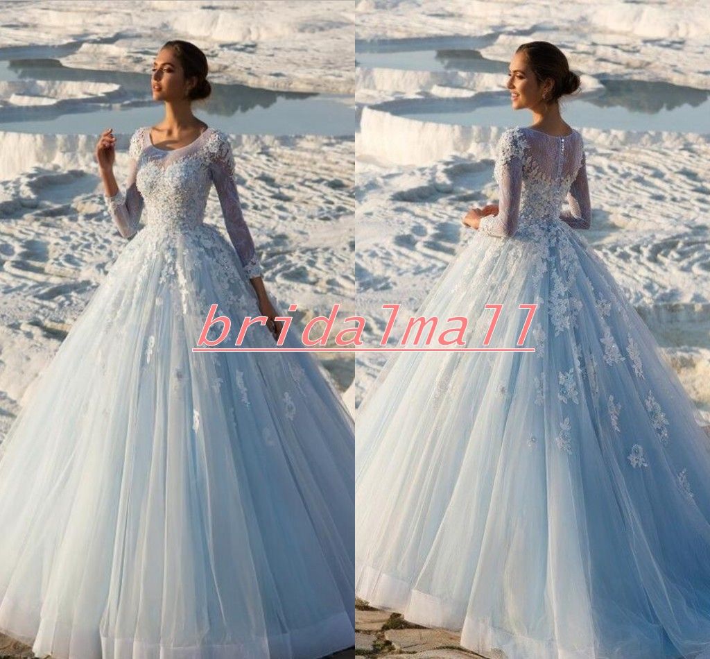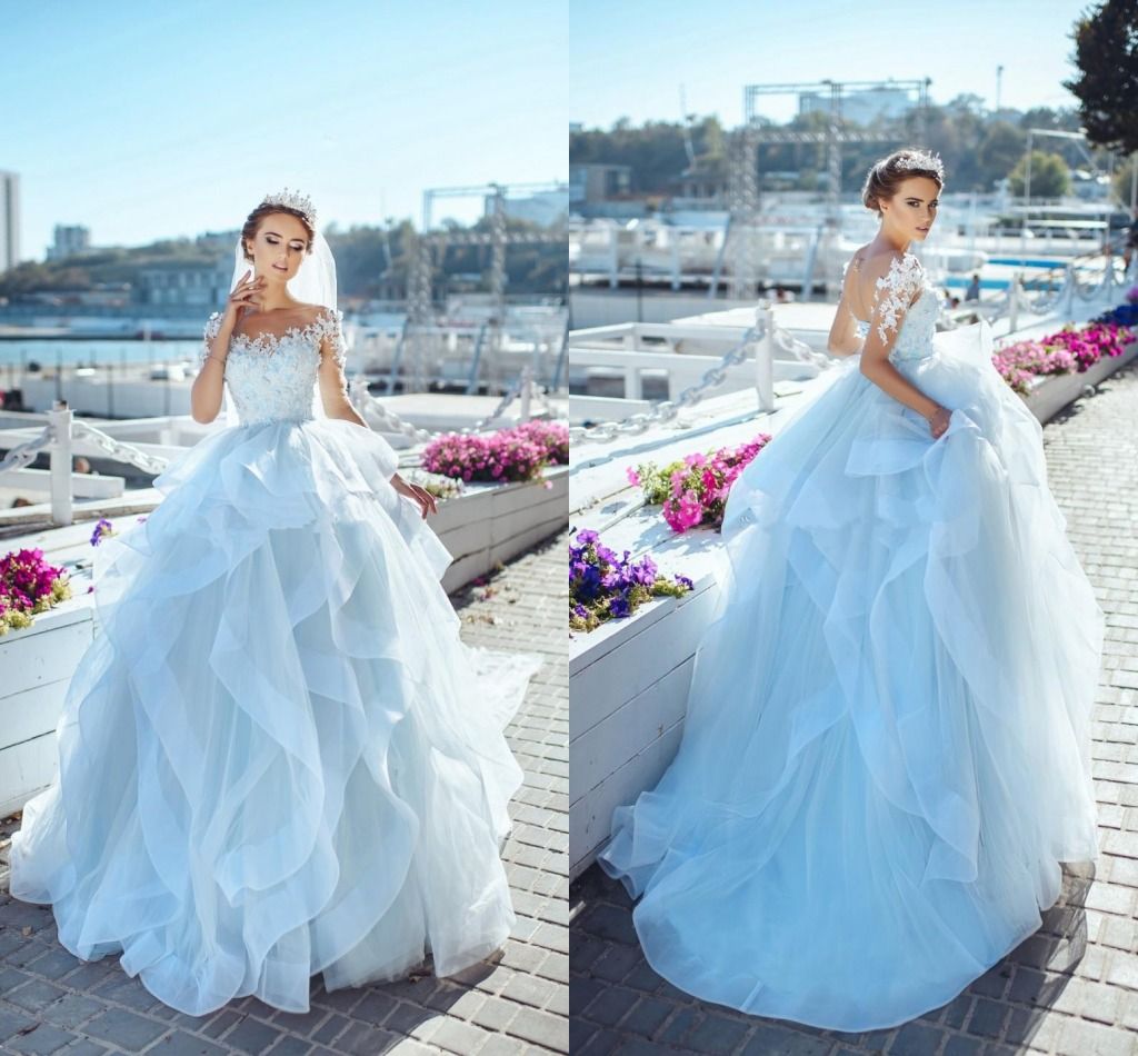 Compre Vestido De Fiesta Azul Claro Vestido De Bola Vestidos De Boda De Ilusion Joya Mangas Largas Vestido De Novia De Encaje De Apliques Por Encargo Playa De Volantes Vestido De Novia