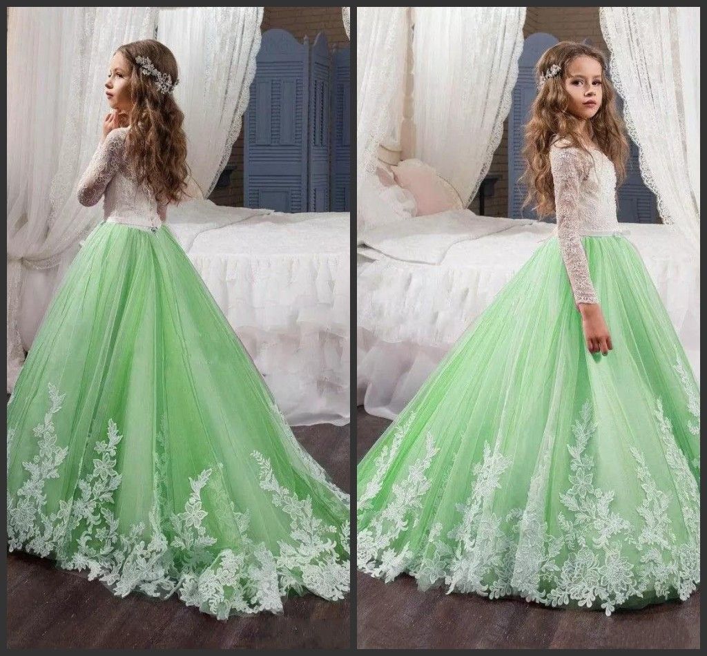 Compre 2019 Nueva Sexy Hermosa Verde Menta Vestidos De Nina De Flores Para Bodas Encaje Blanco Mangas Largas Apliques Ninos Ropa Formal Primera Comunion Vestido A 86 98 Del Cqjie111 Dhgate Com