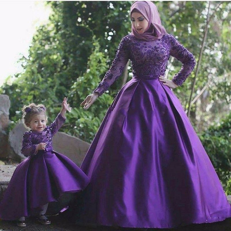 Compre Cordon Moldeado Purpura Preciosa Musulmanes Mom Daughter Partido Para Los Vestidos De Manga Larga De Cumpleanos Floral Hi Low Littler Ninas Desfile De Vestido De Nina De Las Flores A 38 94