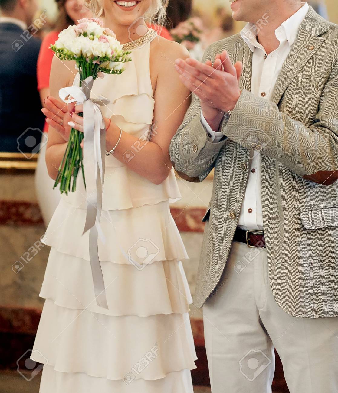 Novia Y Novio De Lujo Con Estilo En Vestido Vintage Aplaudiendo Por Su Matrimonio En La Recepcion De La Ceremonia De La Boda Fotos Retratos Imagenes Y Fotografia De Archivo Libres De