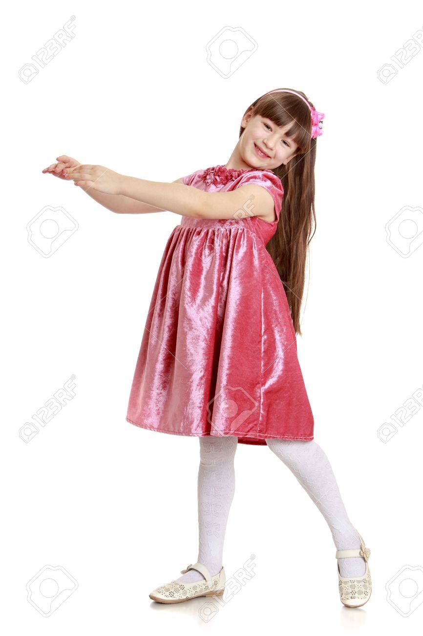Nina De Pelo Largo Adorable En Un Vestido De Terciopelo Largo Y Medias Blancas Estiro Sus Brazos La Chica Entra En La Imagen Que Se Dedica A Una Aislado Studio Teatral Sobre Fondo