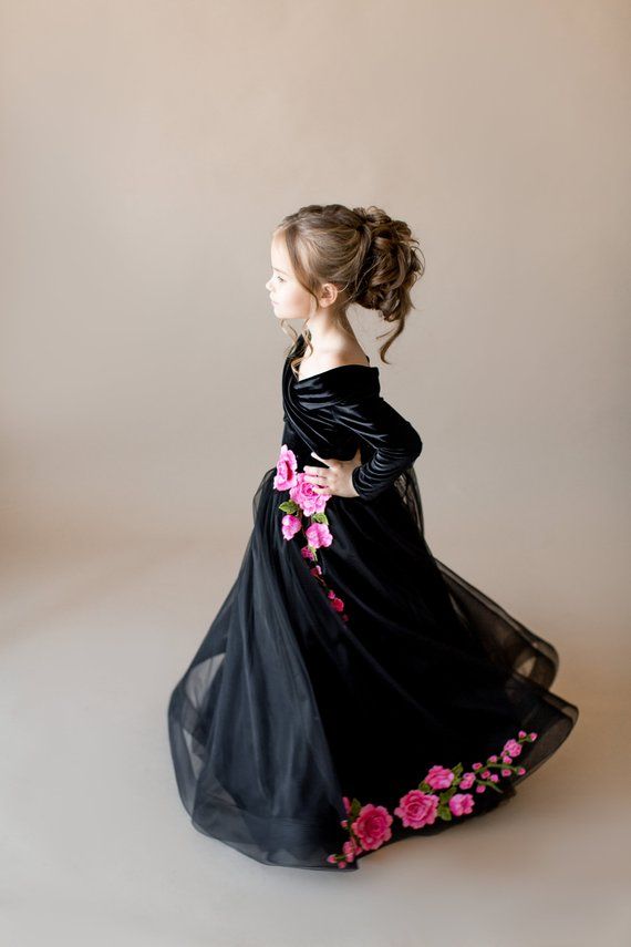 Compre Vestidos Negros Para Nina De Flores Con Apliques Rosados Sobre El Hombro Largo Del Piso Mangas Largas Ninas Vestido De Desfile Vestidos De Ninas De Terciopelo Por Encargo A 74 07