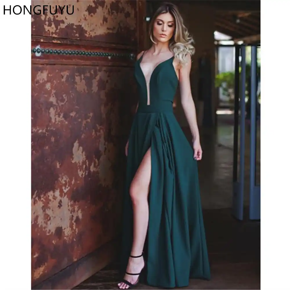 Hongfuyu 2020 Sexy Verde Esmeralda Fiesta Graduacion Vestidos Hundimiento Profundo Cuello Pico Fiesta Vestidos Con Hendidura Satinado A Line Vestido De Noche Largo Formal Vestidos De Graduacion Aliexpress