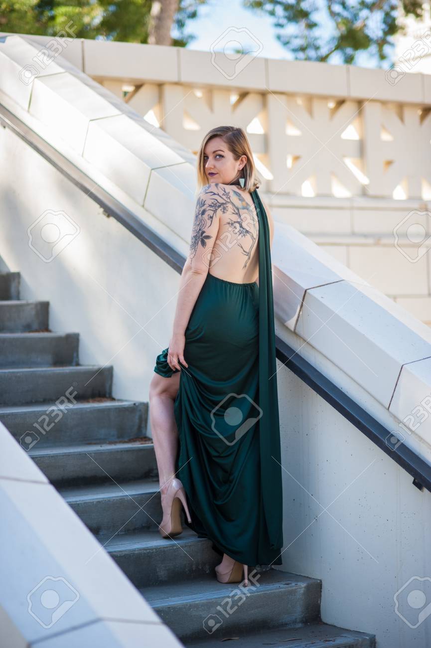 Pierna Desnuda Mostrando A Traves Del Vestido Formal Verde Esmeralda Usado Por La Modelo Rubia Que Sube Las Escaleras Al Ayuntamiento De Ventura El 4 De Febrero De 2018 En California Estados