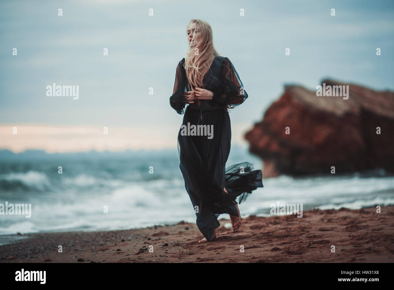 Mujer Joven En El Largo Vestido Negro Transparente Entre La Playa Y El Mar El Viento Sopla El Dobladillo De Su Vestido Fotografia De Stock Alamy