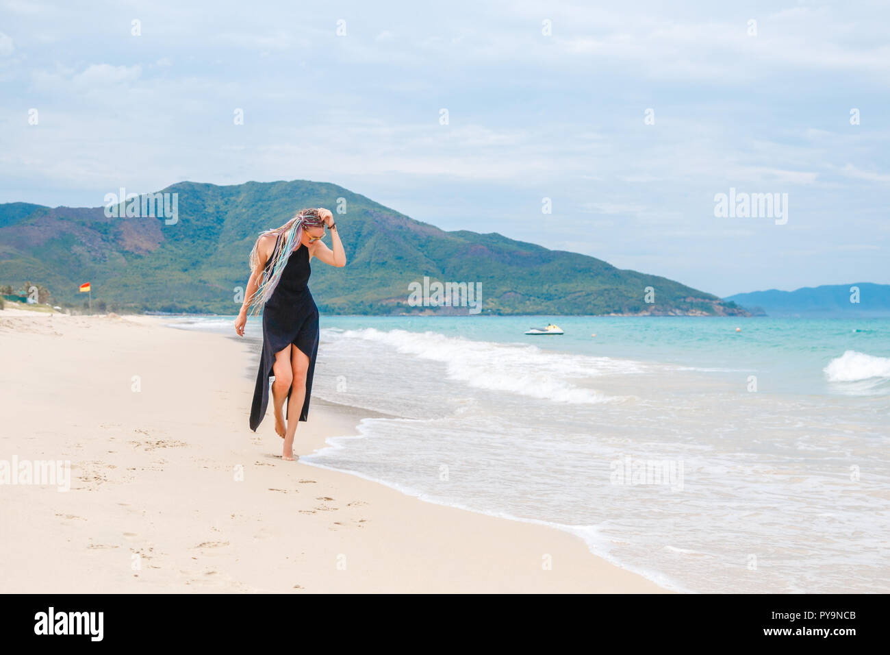 Hermosa Chica En Un Vestido Negro Paseos Por La Playa Fotografia De Stock Alamy