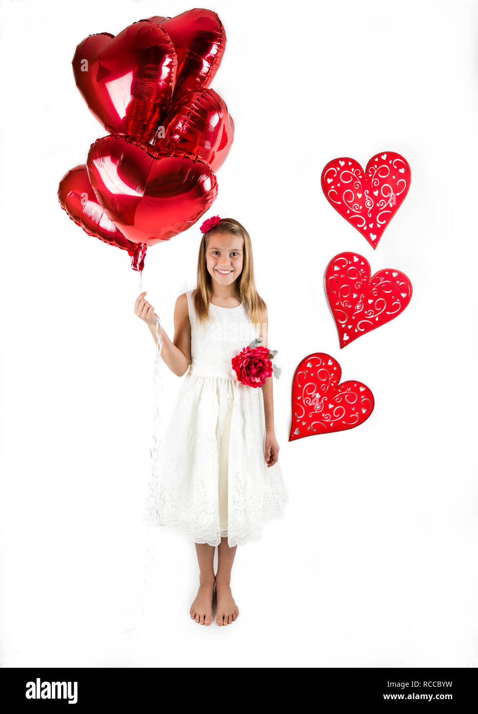 Bonita Chica Con Vestido Blanco Celebra El Dia De San Valentin Y La Celebracion Rojo Brillante De Globos En Forma De Corazon En El Fondo Blanco Brillante Fotografia De Stock Alamy