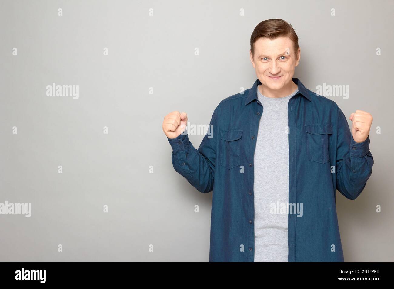 Retrato De Estudio De Feliz Orgulloso Hombre Maduro Vestido De Camisa Azul Sonriendo Levantando Punos En Triunfo Regocijandose En Sus Logros Exito Victoria S Fotografia De Stock Alamy