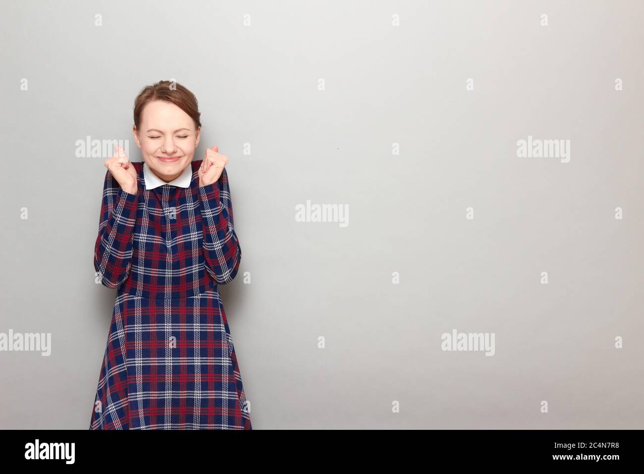 Retrato De Estudio De La Chica Feliz Con Alegria Con Vestido De Cuadros Sonriendo Alegremente Levantando Punos En Triunfo Regocijandose Por Su Exito O Victoria Fotografia De Stock Alamy