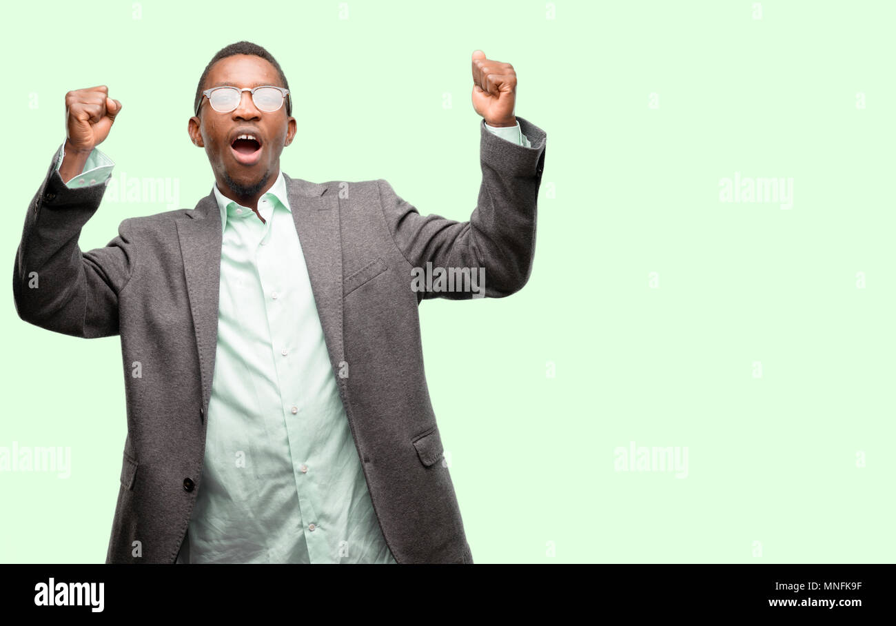 Hombre Vestido Con Chaqueta Negra Africana Feliz Y Emocionado Celebrando La Victoria Expresando Su Gran Exito El Poder La Energia Y Las Emociones Positivas Celebra El Nuevo Trabajo Fotografia De Stock