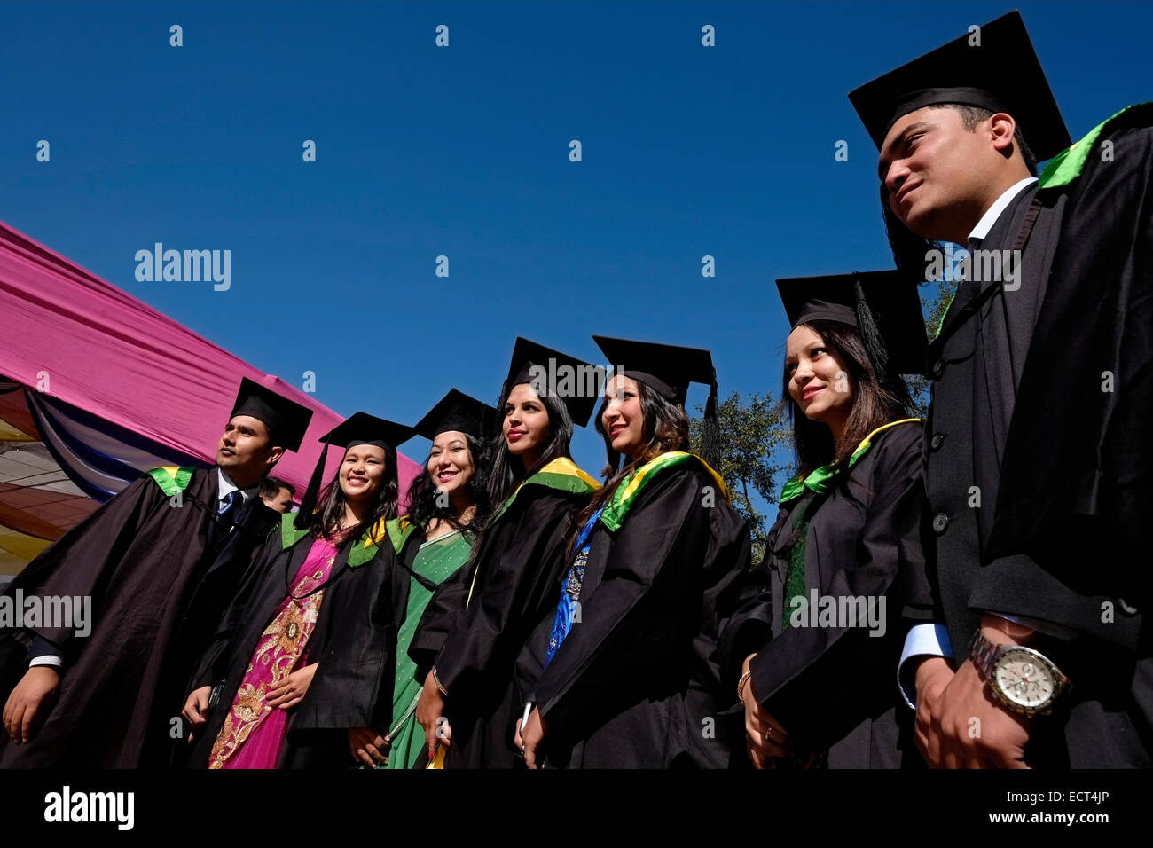 Estudiantes Universitarios Con Un Gorro Y Vestido Posando Para La Fotografia Durante El Dia De Graduacion En La Universidad De Katmandu En La Ciudad De Dhulikhel En Nepal Fotografia De Stock