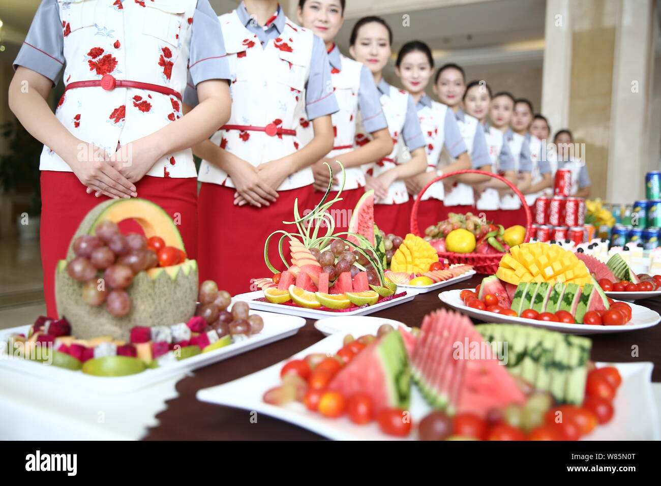 Los Estudiantes Universitarios Vestidos Con Uniformes De Aire Asistentes Preparar Aperitivos Para Dar La Bienvenida A