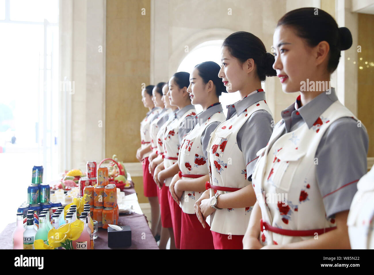 Los Estudiantes Universitarios Vestidos Con Uniformes De Azafatas Ofrecen Zumo De Naranja Para Dar La Bienvenida