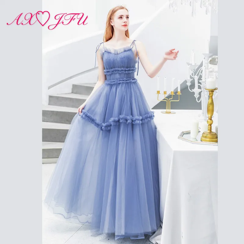 Axjfu Princesa Azul Encaje Novia Saludo Cena Anual Fiesta Noche Vestido De Lujo Espagueti Correa Azul Arco Vestido De Noche 2782 Vestidos De Noche Aliexpress