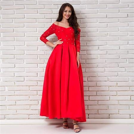 Fejiwo Cuello De Barco Rojo Fuera Del Hombro Vestidos De Fiesta Para La Cena De Manga Tres Cuartos Vestido Largo Hasta El Suelo Vestidos De Noche Amazon Es Hogar
