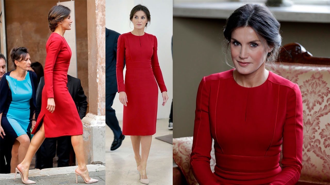Reina Letizia Ortiz Con Vestido De Manga Larga Y Cintura Marcada En Color Rojo De Carolina Herrera Youtube
