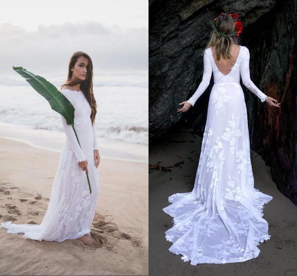 Compre Sencillo Otono Blanco Pais De Encaje Vestidos De Boda De Playa Vestidos De Novia Con Cuello En V Gasa De Manga Larga Vestidos De Novia Bohemios Vestidos De Novia Casual A
