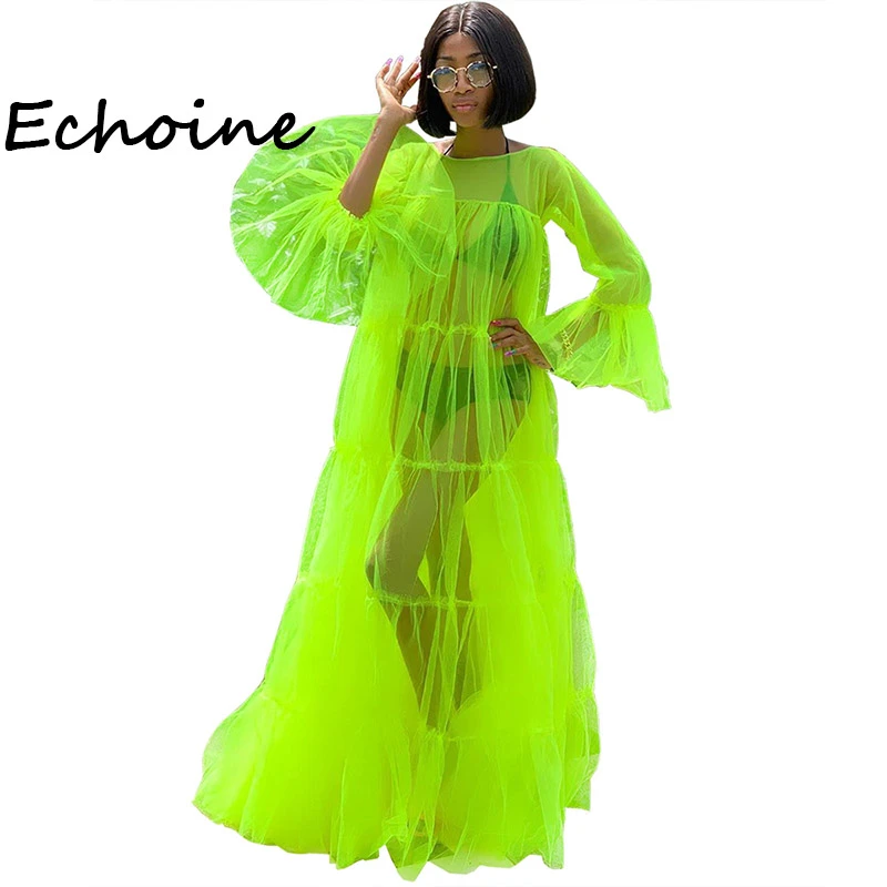 Echoine Vestido Verde Fluorescente Vestido Transparente De Manga Larga Largo Para Fiestas O Ir A La Playa Para Verano Vestidos Aliexpress