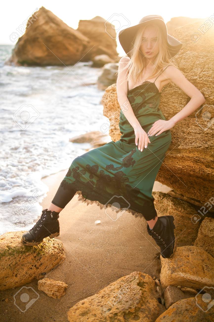 Mujer Joven En Vestido Verde Y Sombrero En La Playa Entre Rocas Amarillas Y Mar Ella Esta De Pie Contra El Sol Fotos Retratos Imagenes Y Fotografia De Archivo Libres De Derecho