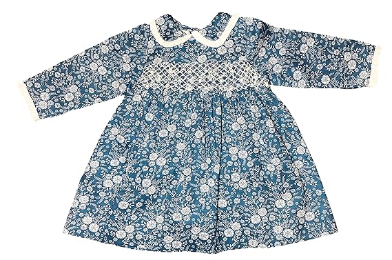 Vestido Otono Invierno Nina Y Bebe Bordado A Mano Smock Cuello Manga Larga Flor Bicolor Azulon Patricia Mendiluce
