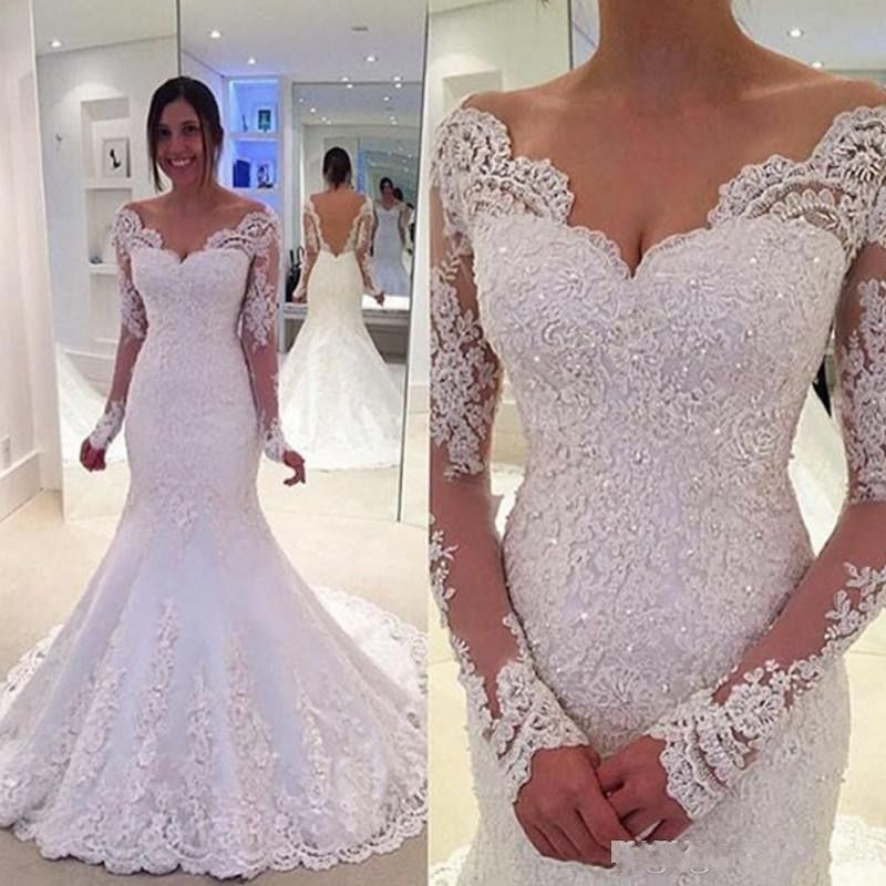 Compre 2018 Vestidos De Novia De Sirena Modernos Y Baratos Mangas Largas Cuello En V Marfil Blanco Apliques De Encaje Con Cuentas Tren De Espalda Abierta Vestidos De Novia Personalizados A 120 03