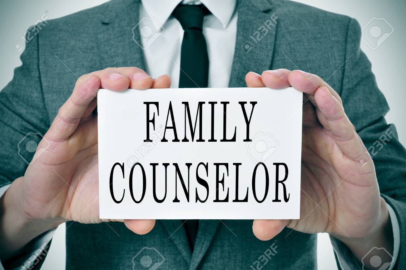 Un Hombre Que Llevaba Un Traje Sentado En Un Escritorio Con Una Placa De Identificacion Del Escritorio Frente A El Con El Consejero De Familia De Palabras Fotos Retratos Imagenes Y Fotografia