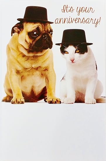 Amazon Com Es Tu Aniversario Tarjeta De Felicitacion W Perro Pug Y Pareja De Gatos Tiempo Para Obtener Todos Los Vestirse Para Una Noche En La Ciudad Matrimonio Amor Office Products